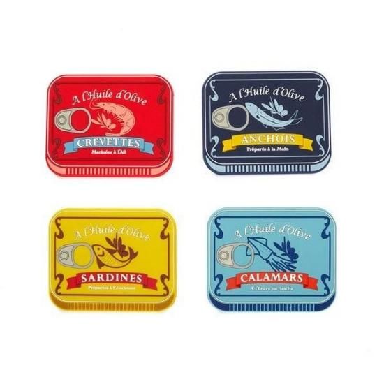 イワシ、イカ、アンチョビ、エビの4種類の缶詰をイメージした、レトロで楽しいデザインです。