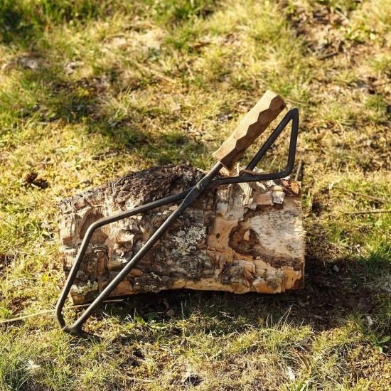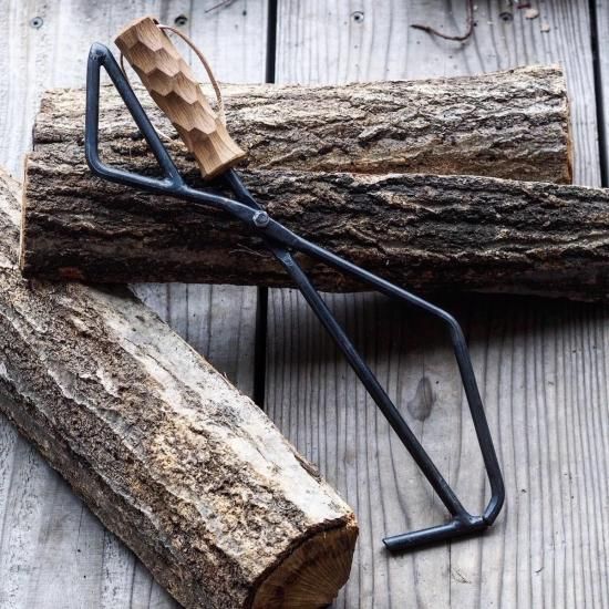 鉄とナラ材の無骨さを前面に押し出しながらも、スマートなシルエットを持つ薪ばさみ。