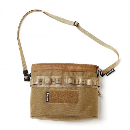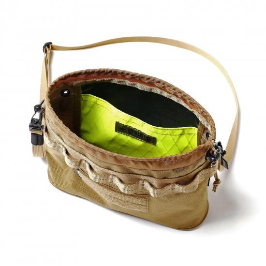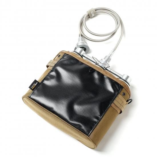 裏面にはガス缶を地置きした際に汚れが拭きやすいようターポリン素材を採用。内部にはショルダーバッグとして利用時に使い易いよう仕切りポケットを配置しました。