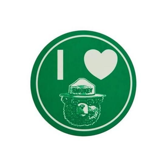 Smokey Bear スモーキーベア I LOVE SMOKEY ステッカーは、アメリカで70年以上も愛されている山火事防止キャンペーンのマスコット「スモーキーベア」の畜光円形のステッカーです。