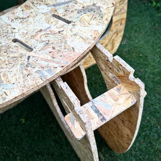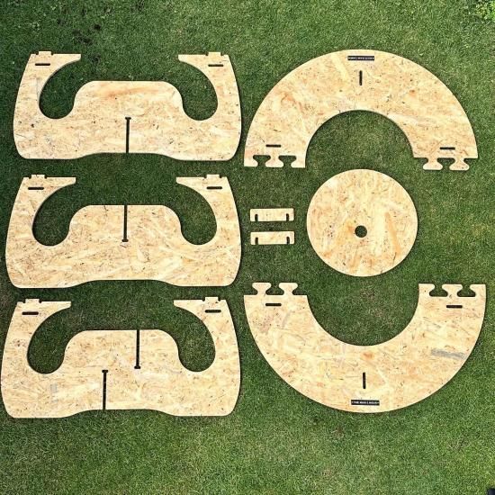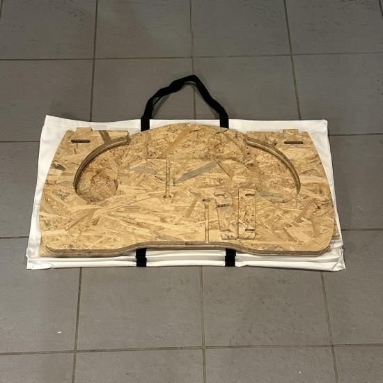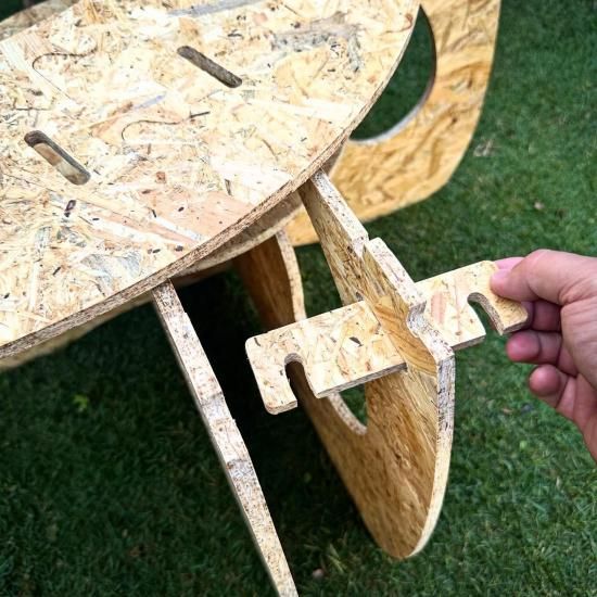 メインの天板はパズルのようにバラしてコンパクトにでき、テーブルの安定感を出す2つの小さなパーツは内側ポケットに収納できます。