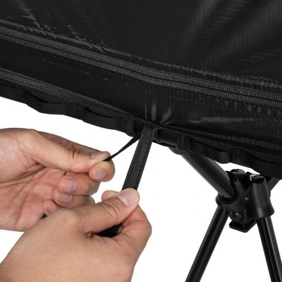 コンパクトに収納でき、フィッシングキャンプやキャンプツーリング、オートキャンプなど幅広いシーンで活躍します。コットテントを使えば、簡単にプライベートな寝室空間を作り出すことが可能。メッシュ素材を採用しているため通気性が高く、心地よい風を感じながら星空観察も楽しめます。ハブを使った構造設計でテントの壁がほぼ垂直に立っており、一人用ですが十分な空間を確保し、ユーザーが横になっているときや座っているときにも快適に過ごすことができます。また、インナーテント内部の天井と下端に各2つずつ、計4つのメッシュポケットがあり、小物を収納するのに便利です。テントはコットにしっかりと固定されるため、安定した快適な睡眠をサポートします。ケースのベルクロ部分には、Helinoxの様々なパッチを貼り付けることができ、自分だけのオリジナルケースを作ることができます。また、タクティカルコレクションの一部として、過酷な環境下でも耐えうる性能を追求した設計になっており、アウトドア愛好家の期待に応えるギアです。